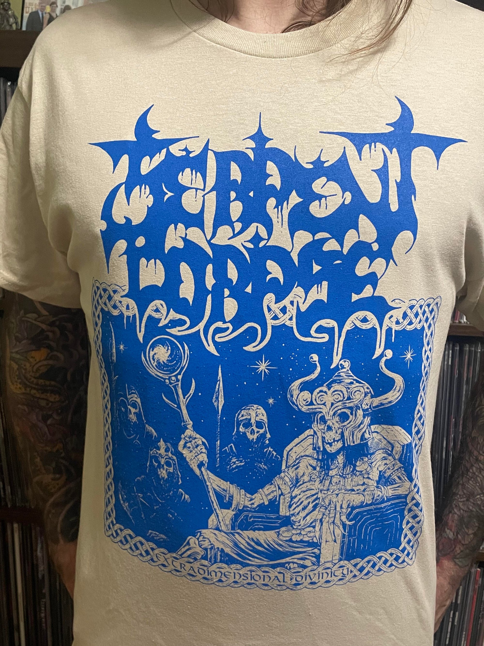Blue print on sand colour Gildan Ultra Cotton shirts Front print only Image by @ghastly_mcnasty Printing by TheTotalEnd